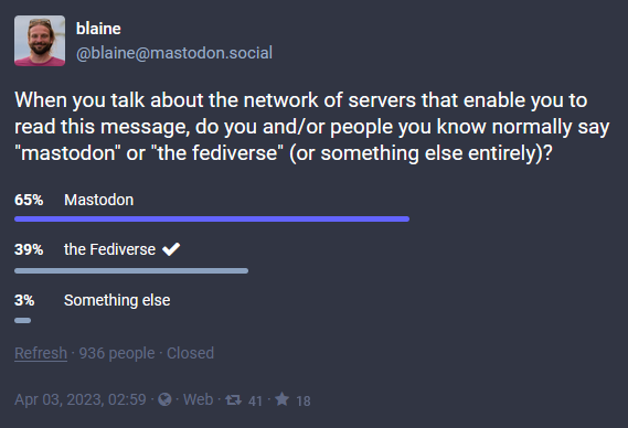 For now, there are no easy answers. We are at a point in time where names are still in active flux. I’m excited to return to this article in a year’s time, and reflect on how opinions and usage of words like fediverse and Mastodon have changed.