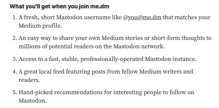 Let’s start with number 2: easy sharing of your Medium posts with the Mastodon network. This feels like a missed opportunity. From a branding perspective it is understandable to use the term Mastodon network. But if you want to advertise the great reach that you can get, it feels weird to call it by the smaller reach name (Mastodon) instead of the entire fediverse. Throughout the entire piece, Medium consistently talks about Mastodon, but never mentions the fediverse. Considering that the entire point is to advertise to potential users, this feels like either a massive missed opportunity, or that Medium itself has not really internalised what the difference between Mastodon and the fediverse actually is. They want to convice users that by joining the me.dm server you get great reach, so why not sell the actual great reach that you get? Instead, they sell the smaller (but still signficant reach) that you get on Mastodon. This point also raises the question: how is this different from any other fediverse server?